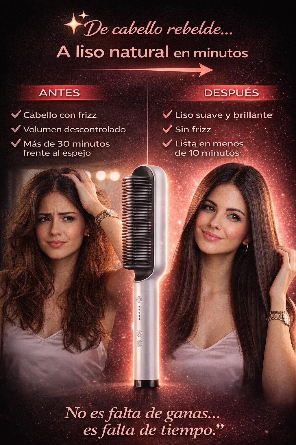 Vivo en clima húmedo y siempre tenía frizz. Con el cepillo iónico se elimina la estática y mi cabello queda liso y brillante en minutos.